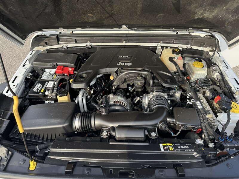 - Chassis and exterior: Classic Wrangler design with removable roof and doors, fold-down windshield, robust body-on-frame construction, and factory-installed 17-inch wheels. Exterior finished in Bright White Clear Coat.