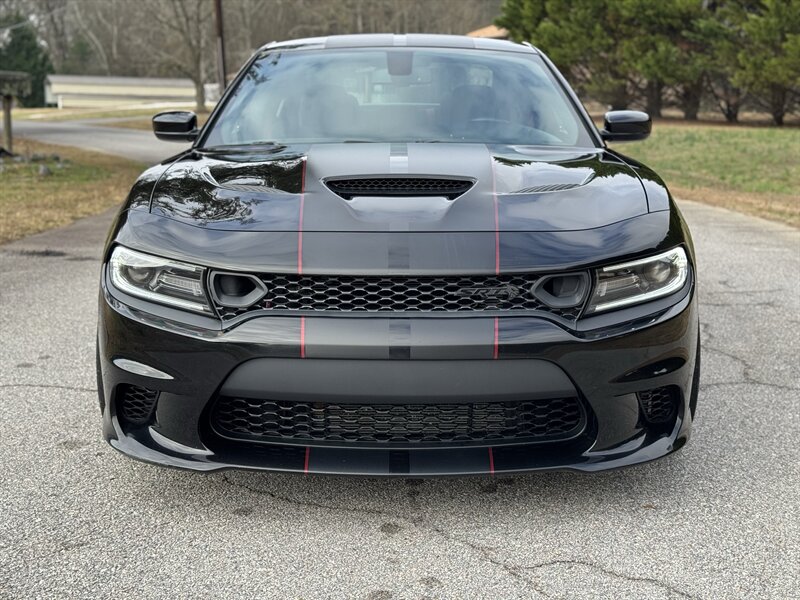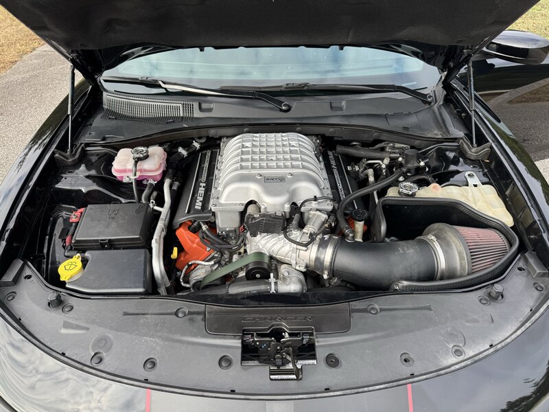 - Distinctive Hellcat styling cues including aggressive front fascia, functional hood air intake and rear spoiler design elements typical of the SRT Hellcat model.