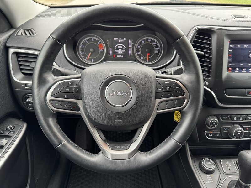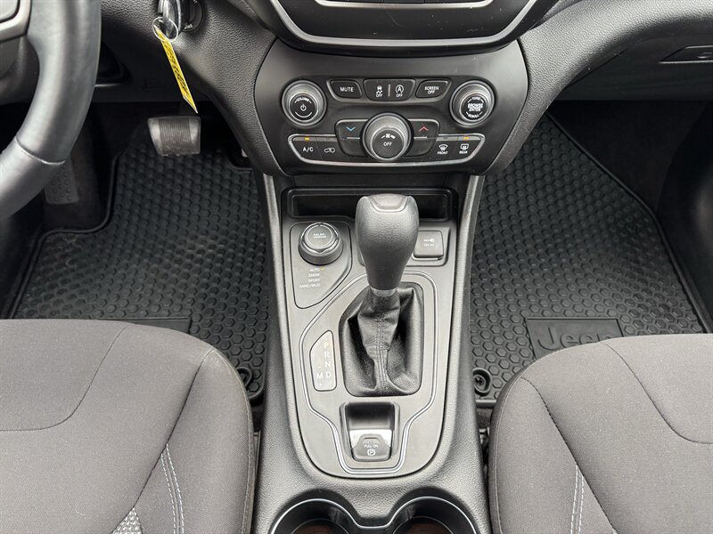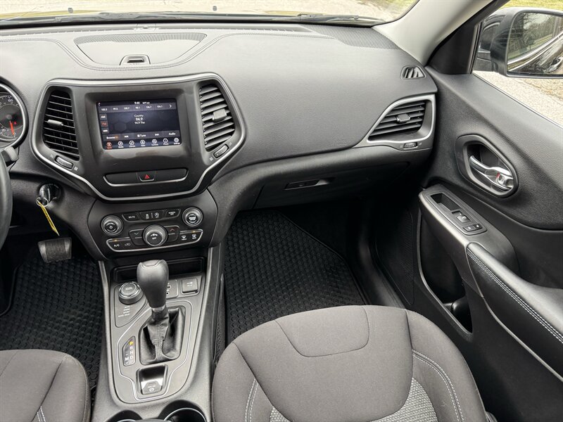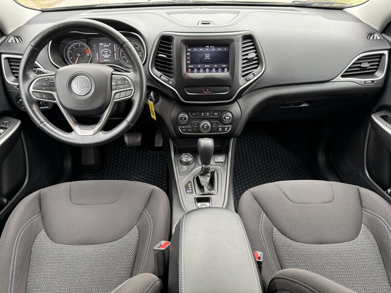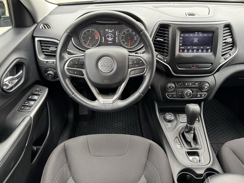 2019 Jeep Cherokee Latitude — Diamond Black Crystal Pearl Coat exterior with Black interior. Excellent overall condition. Powered by a 2.4L I4 Tigershark engine producing 180 hp and 171 lb-ft of torque, paired with a nine-speed automatic transmission and configured with front-wheel drive. EPA fuel economy is 21 MPG city and 29 MPG highway.