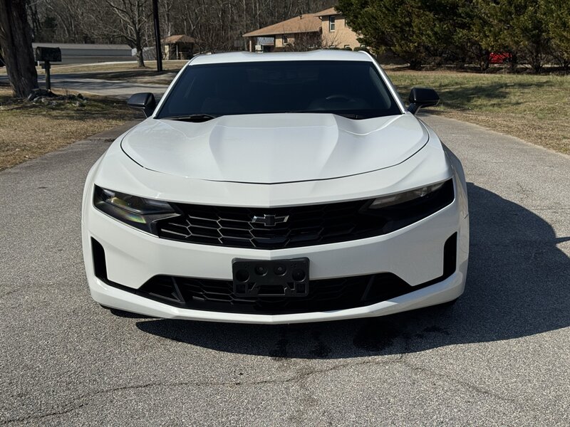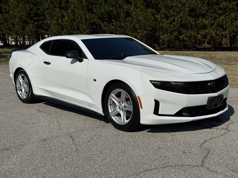 - Exterior: Summit White factory paint applied over the Camaro’s signature coupe body with sculpted hood and muscular fenders. Factory alloy wheels, power-adjustable exterior mirrors, and factory lighting including standard headlamps and daytime running lights are fitted.