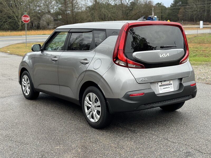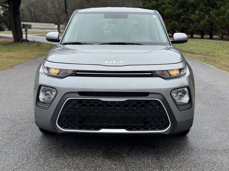 2022 Kia Soul LX — Steel Matte Gray exterior, Black cloth interior. This well-maintained vehicle has fewer than 4,000 miles (averaging under 1,000 miles per year), a clean CARFAX report, and a single prior owner. It is in excellent overall condition and achieves an EPA-estimated 28 MPG city / 33 MPG highway.