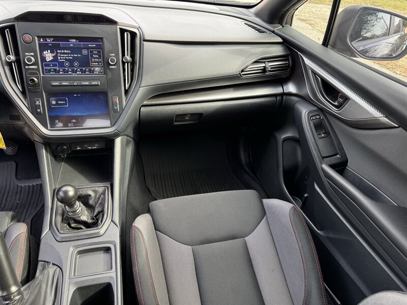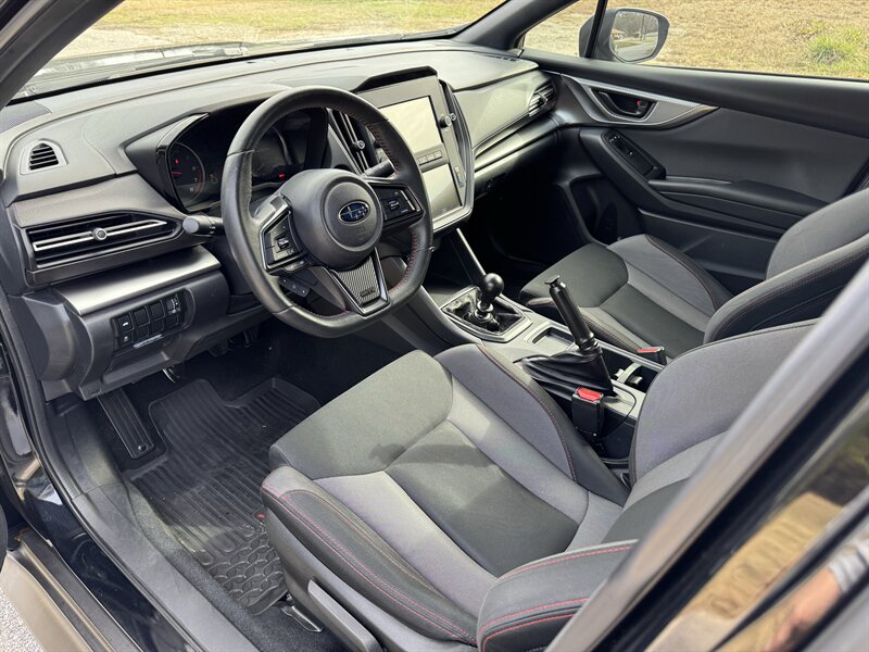 2022 Subaru WRX in Crystal Black Silica with a Black cloth interior accented by red stitching. Powered by a 2.4L turbocharged flat-4 producing 271 hp and 258 lb-ft, paired with full-time AWD and a sport-tuned suspension. Below 41,000 miles (averaging under 9,000 miles/year), rated 19 MPG city / 26 MPG highway, and in excellent overall condition.