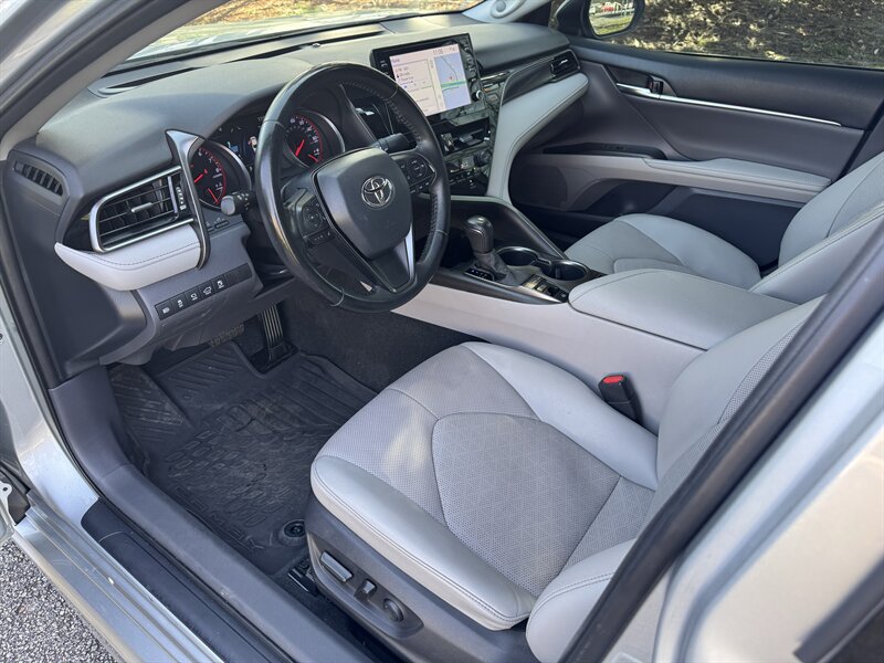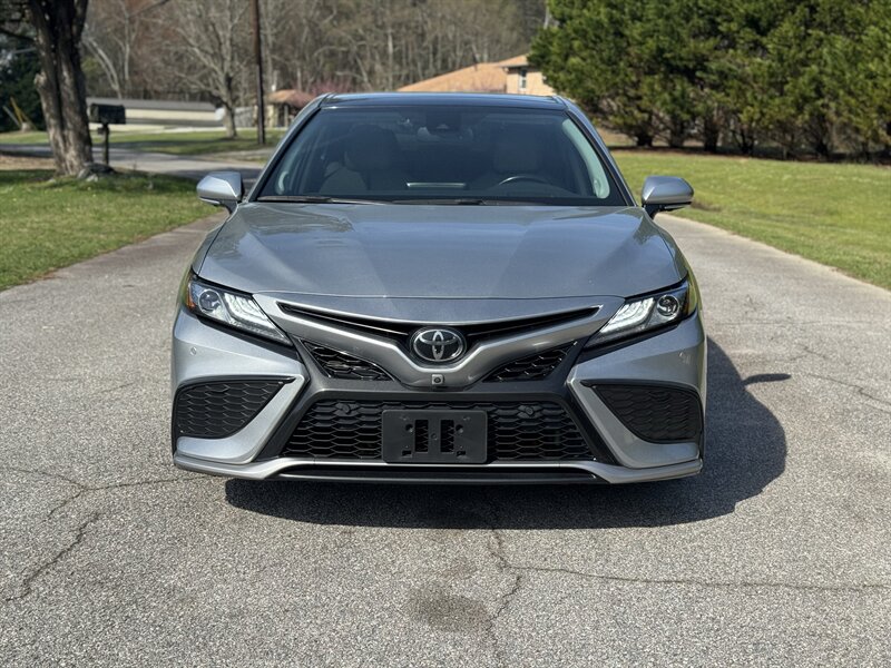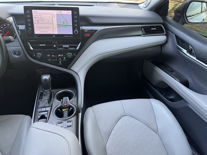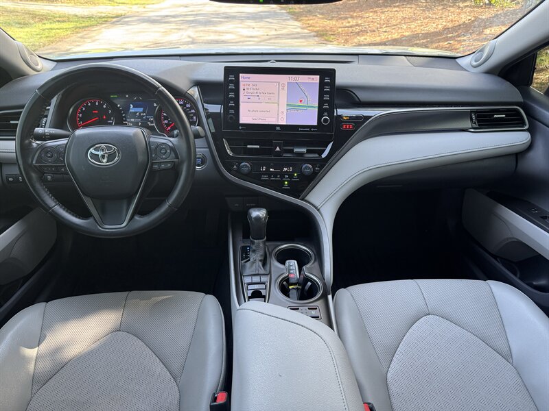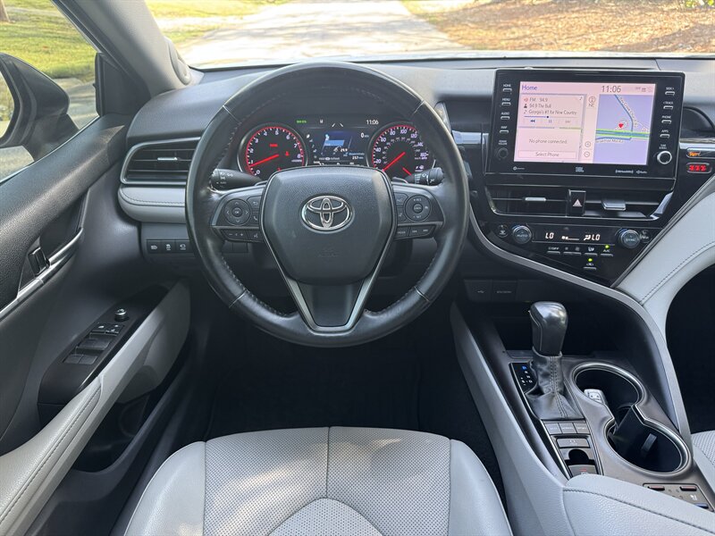 2022 Toyota Camry XSE — Celestial Silver Metallic exterior, Ash interior. Powered by a 2.5L I4 producing 206 hp and 186 lb-ft of torque, paired with an 8-speed automatic transmission for responsive everyday performance. This Camry returns an EPA-estimated 27 MPG city / 38 MPG highway. Vehicle is in excellent overall condition, has a clean CARFAX and one previous owner. Included factory options and packages for this vehicle are the Driver Assist Package, Navigation Upgrade Package, and a Panoramic Glass Roof.