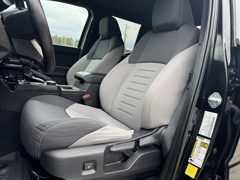 Interior and convenience features focus on everyday usability and durability. The Black cloth seating is supportive and designed for daily wear; rear seating folds to expand cargo flexibility in crew cab configurations. Standard comfort items include air conditioning, power windows and door locks, remote keyless entry, cruise control, adjustable steering column, and a center console with storage. The cabin finishes and layout emphasize functionality with durable materials well suited to active use.